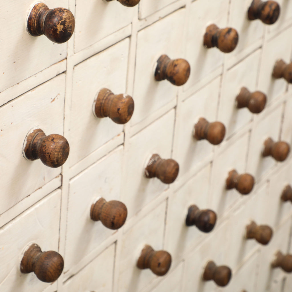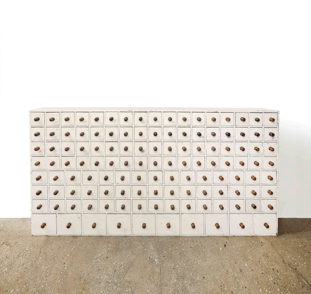 Painted wood apothecary-style cabinet constructed with a bank of 115 drawers arranged in a clean, symmetrical grid.