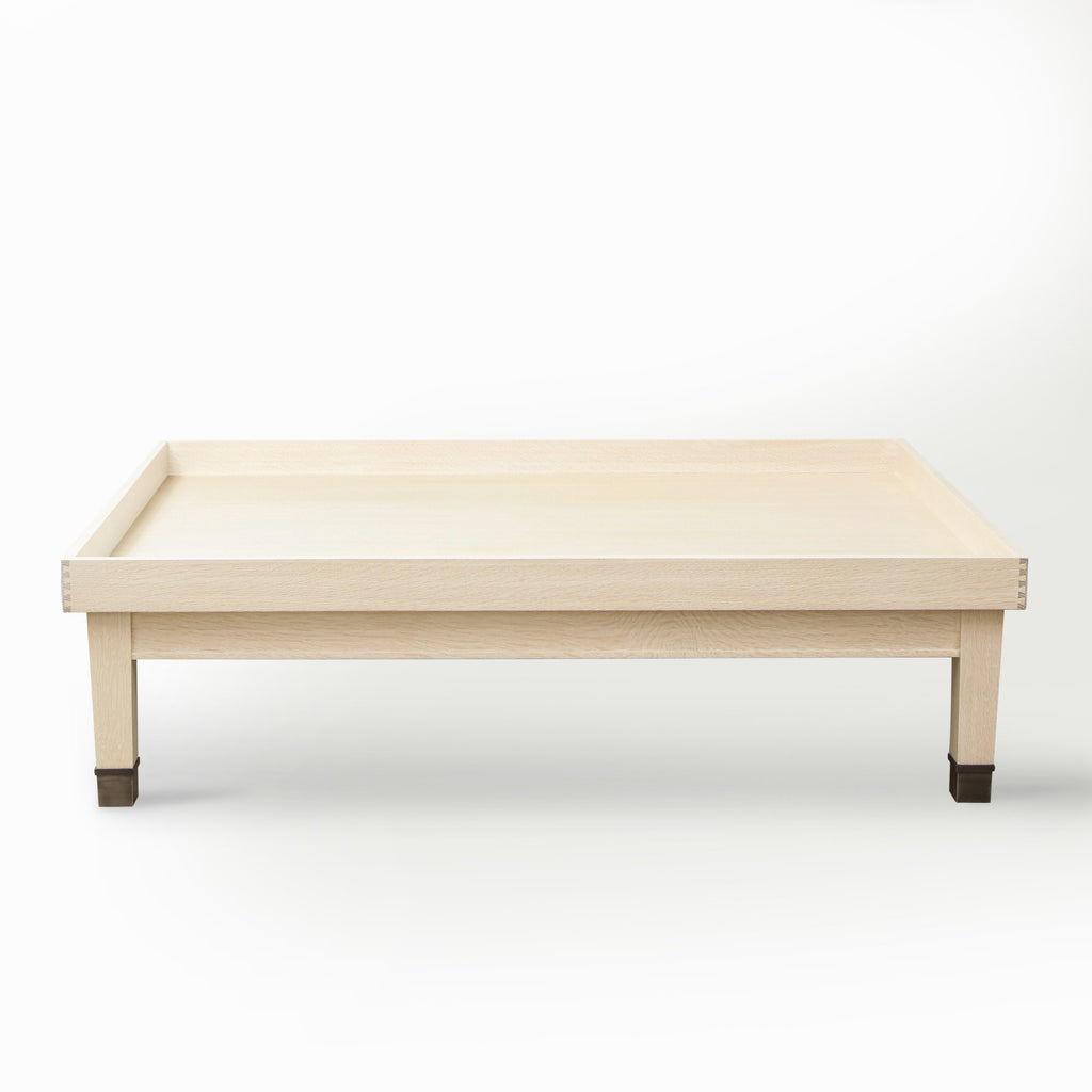 DETAILS: SOLID OAK COFFEE TABLE | BUILT-IN TRAY WITH MODERN ARCHITECTURAL LINES AND DOVETAIL CONSTRUCTION | SHOWN IN BLEACHED CERUSED OAK WITH ANTIQUED BRASS SABOTS | ALSO AVAILABLE IN OAK, SMOKY CERUSED OAK, LIGHT CERUSED OAK, AMERICAN WALNUT, & LACQUERED MAPLE
